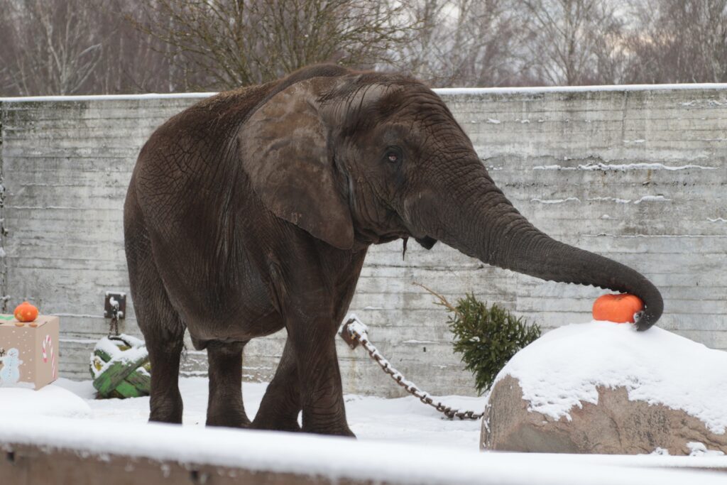 Seejärel nägid pidulised, kuidas elevant Carl oma lumises õueaedikus kuuse maiustest tühjaks sõi ja siis ka kõrvitsad põske pistis.